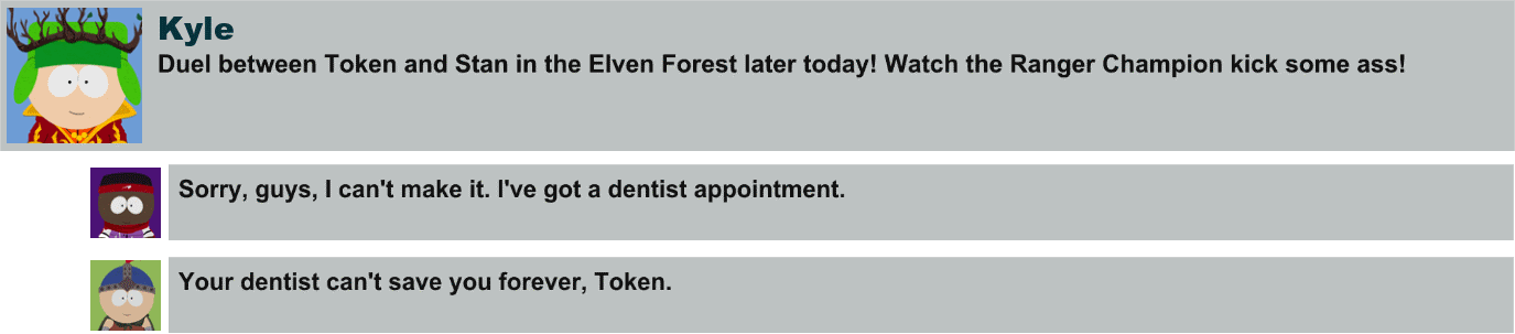 | Kyle Broflovski | Stan Marsh | Chris Donnely | Bradley Biggle | Bill Allen | DogPoo Petuski | Faction:Drow Elves | Goth Kids | Fosse McDonald | Jason | Jimmy Valmer | Sparky | The New Kid | Timmy Burch