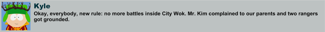 As for his Role in Phone Destroyer, see Gunslinger Kyle, Bounty Hunter Kyle, The Master Ninjew, Kyle of the Drow Elves, and Human Kite (Phone Destroyer).