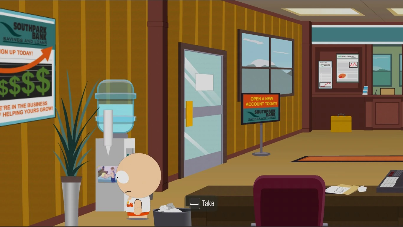 Bedside Manners | Located next to the water dispenser inside Bank of South Park. | Sandblaster ability required to access into the place. | |